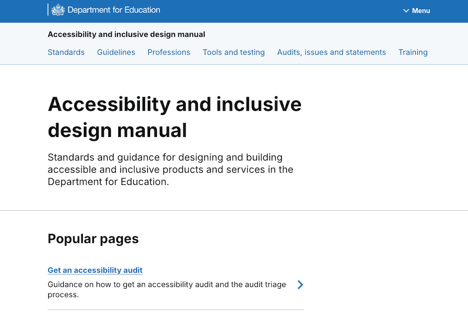 - Late 2023 – Early 2024: Internal development of the initial manual framework, consolidating existing DfE and GOV.UK accessibility standards.